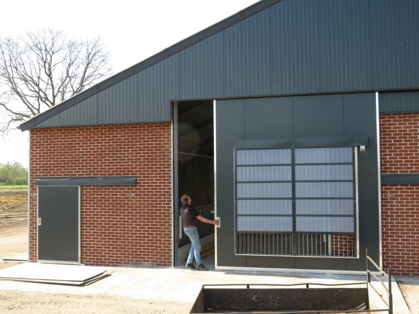 Schuifdeuren met windsturing zijn sandwich paneeldeuren met een lamellenpakket. Dit lamellenpakket bestaat uit een RVS kader met aluminium lamellen. Deze combinatie is een uniek concept, speciaal door ons ontwikkeld. Een vast lamellenpakket is ook mogelijk. Deze schuifdeuren worden eigenlijk altijd gecombineerd met een rolluik (optioneel: volledig geautomatiseerd). Dankzij een mechanische koppeling met uw ventilatoren zorgt u zo voor goede ventilatie in uw stal. Klik hier voor meer informatie over onze totaaloplossingen.